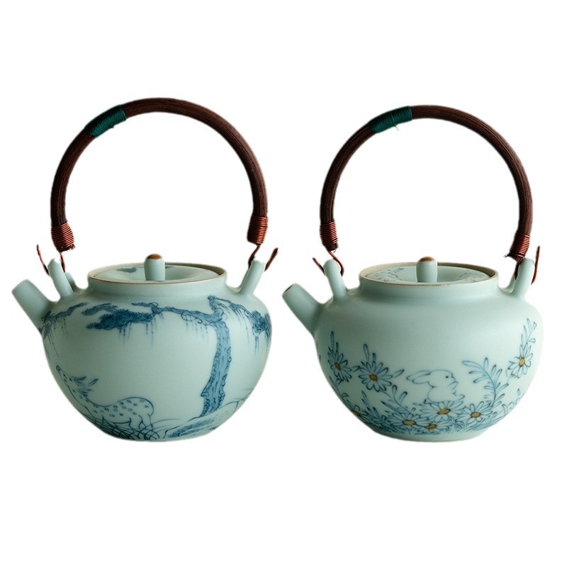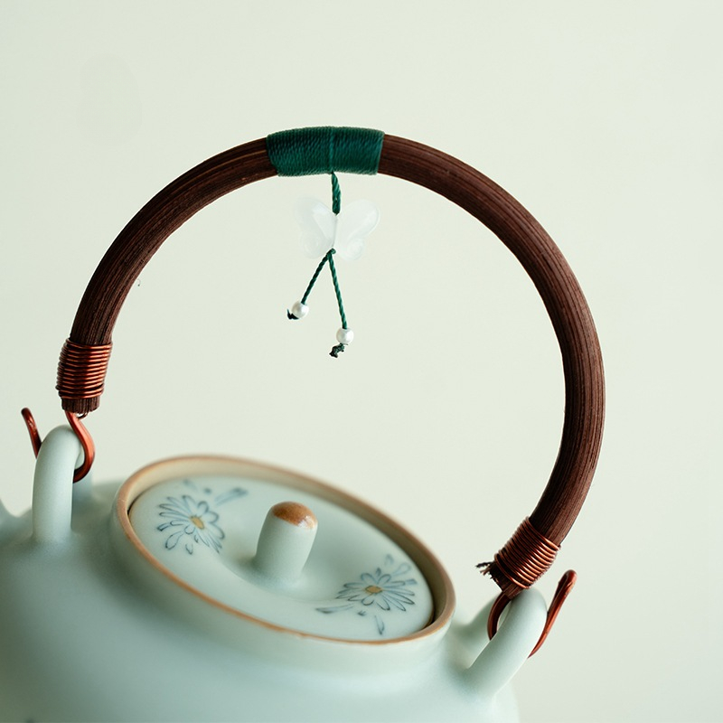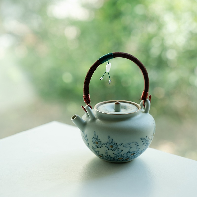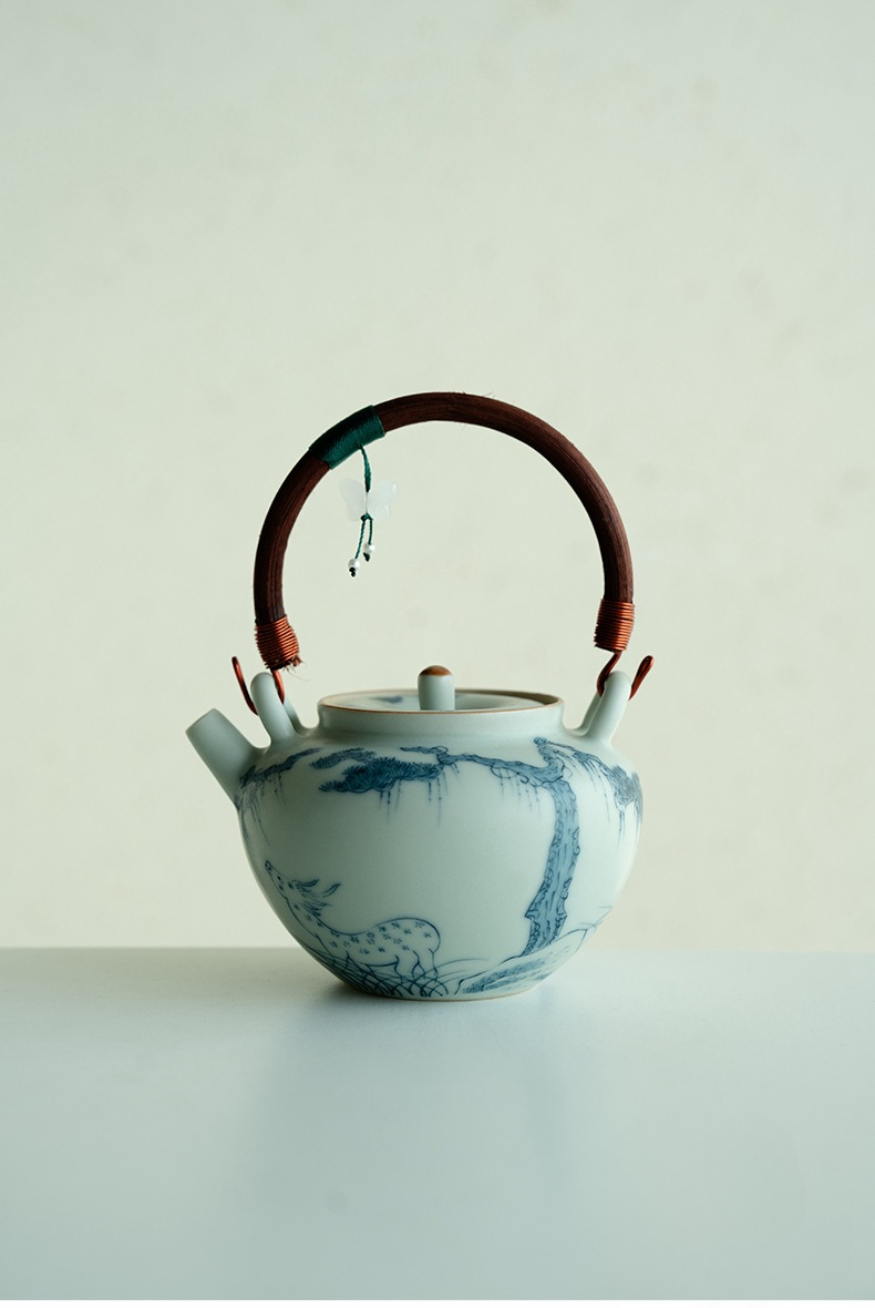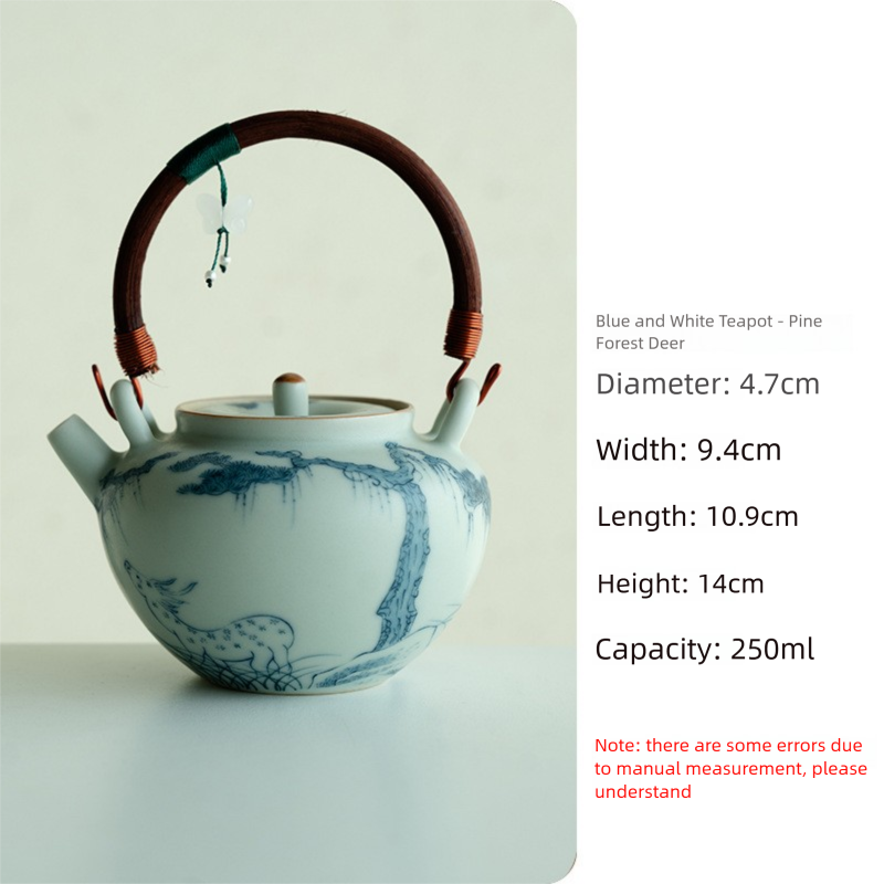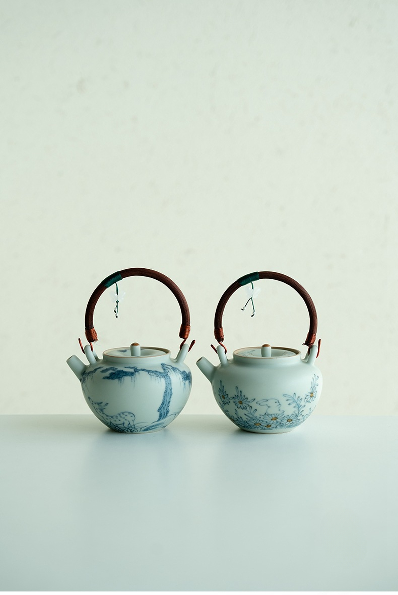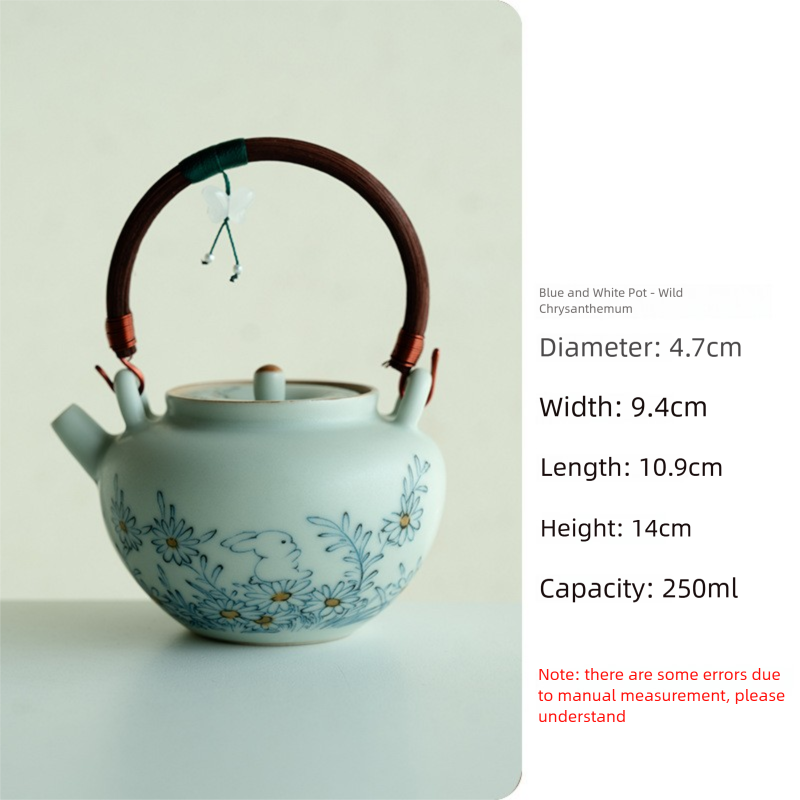 Blue and White Ceramic Teapot with Wooden Handle and Hanging Pendant