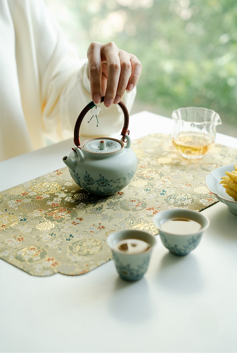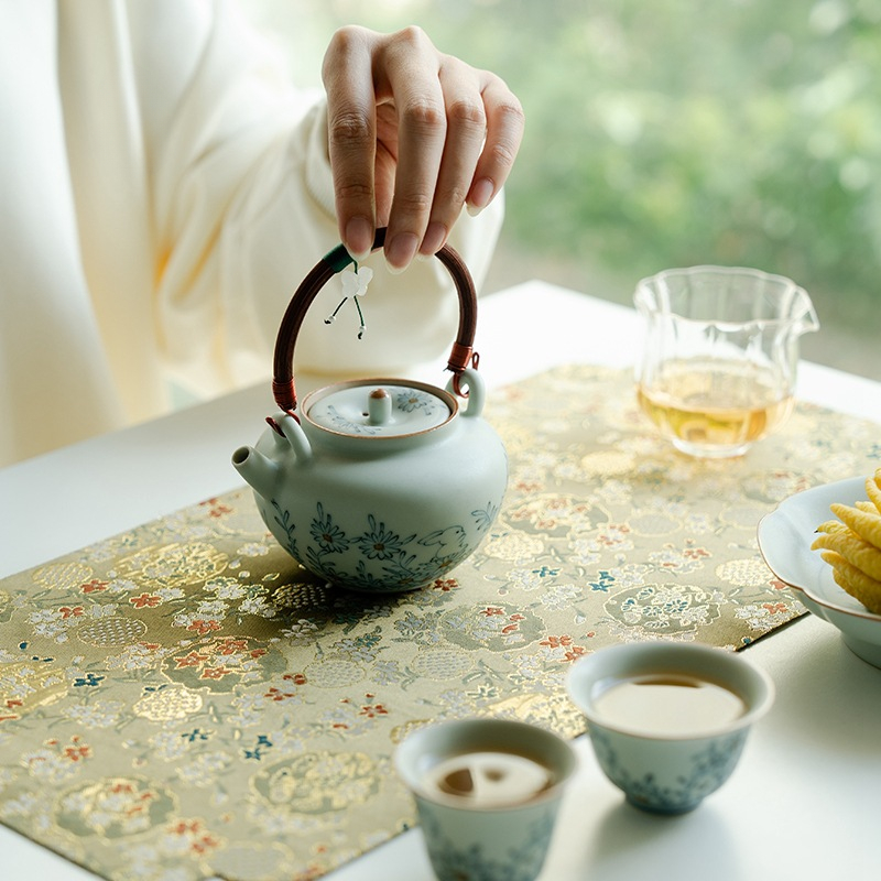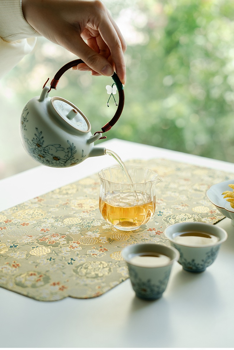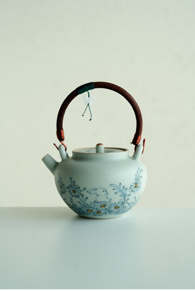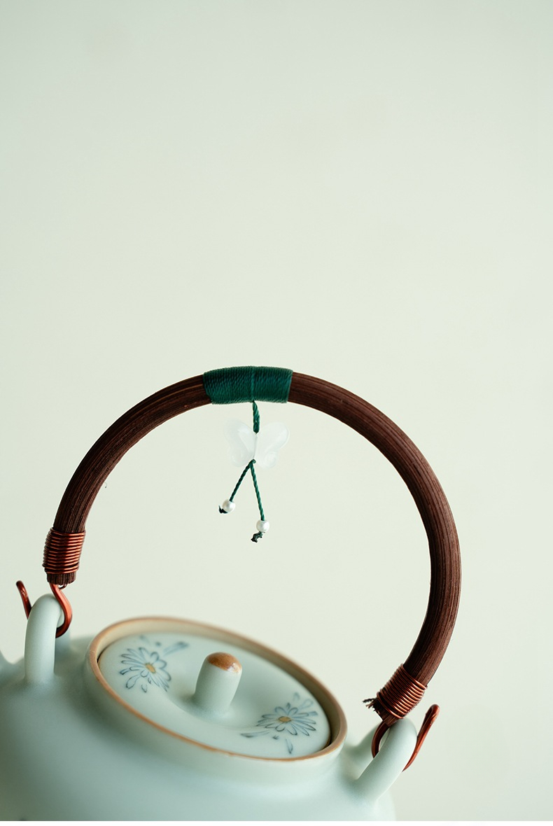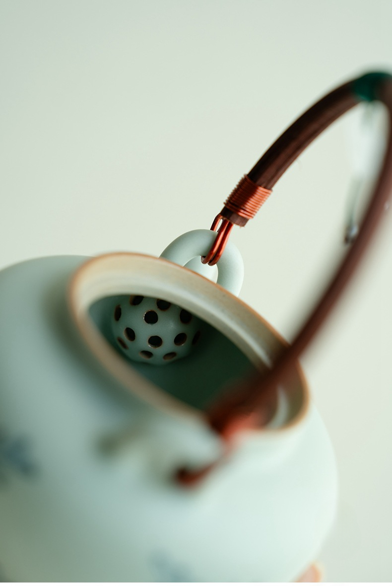 Blue and White Ceramic Teapot with Wooden Handle and Hanging Pendant