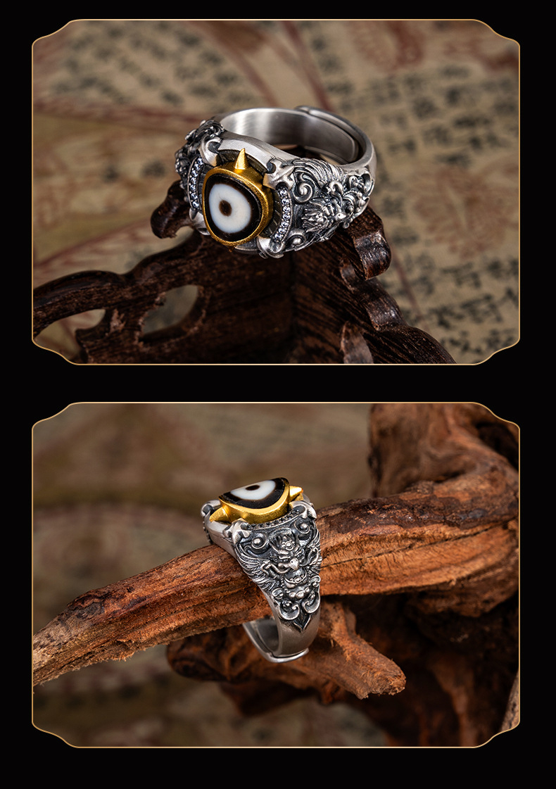 Tibetan Style Pure Silver Dzi Bead Great Bird Ring